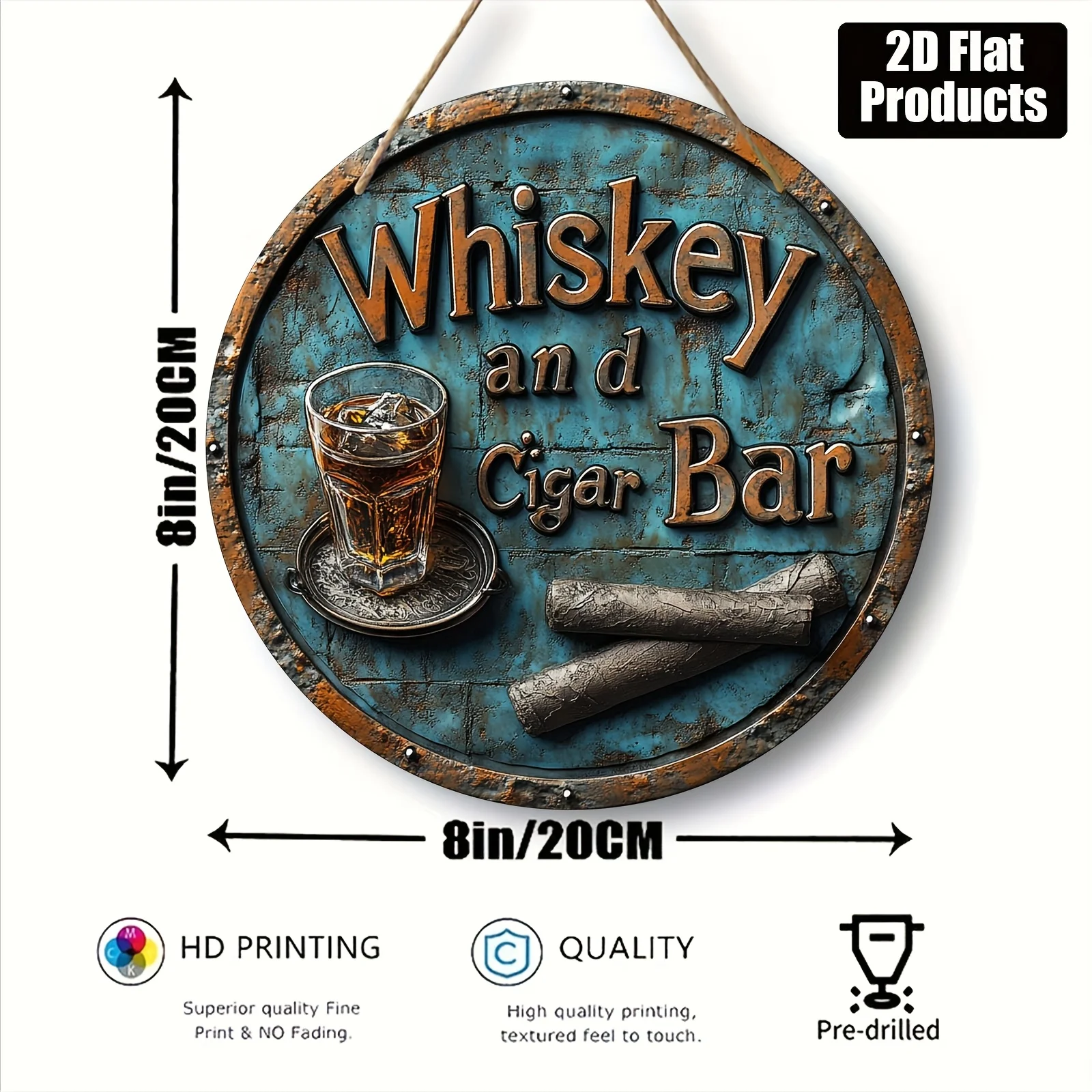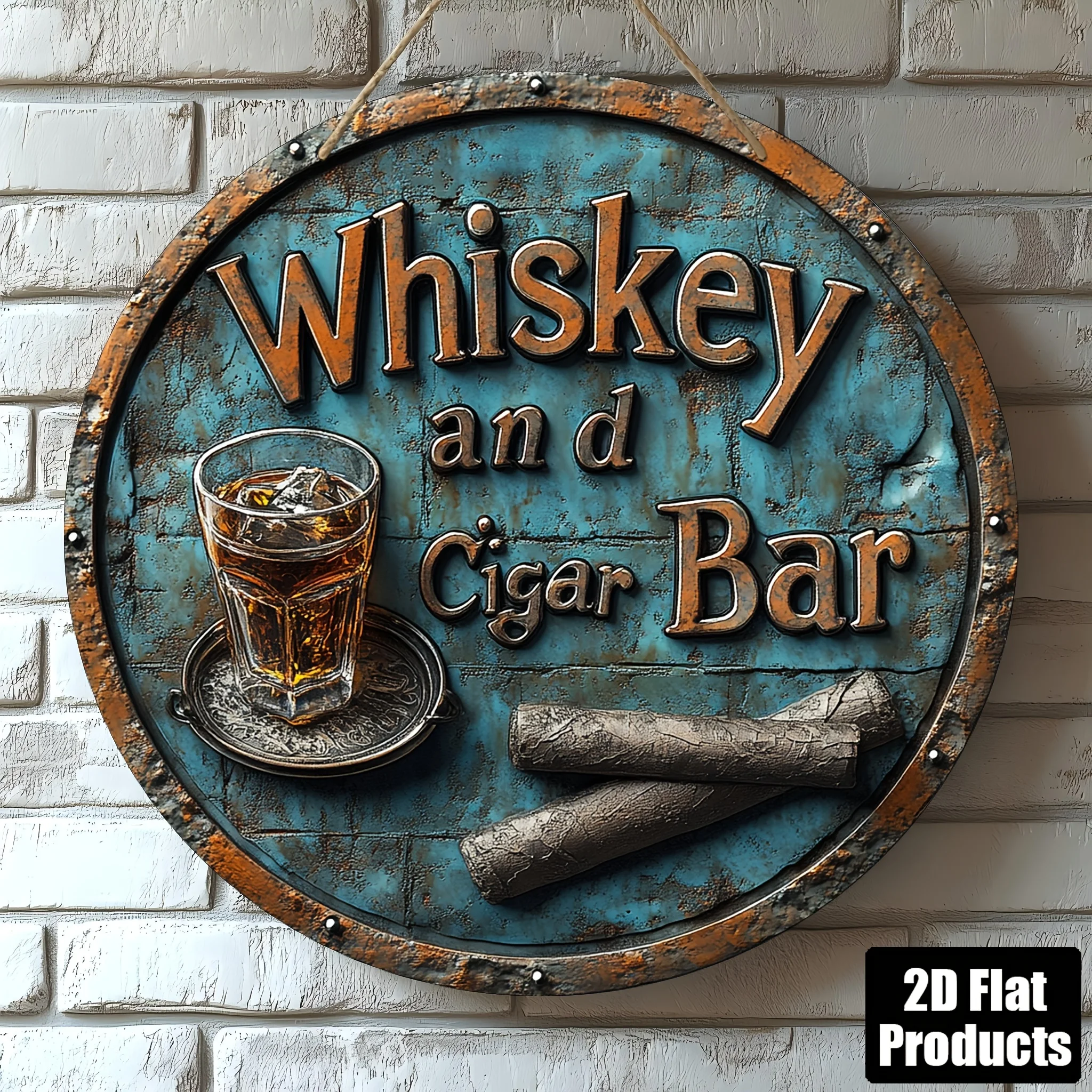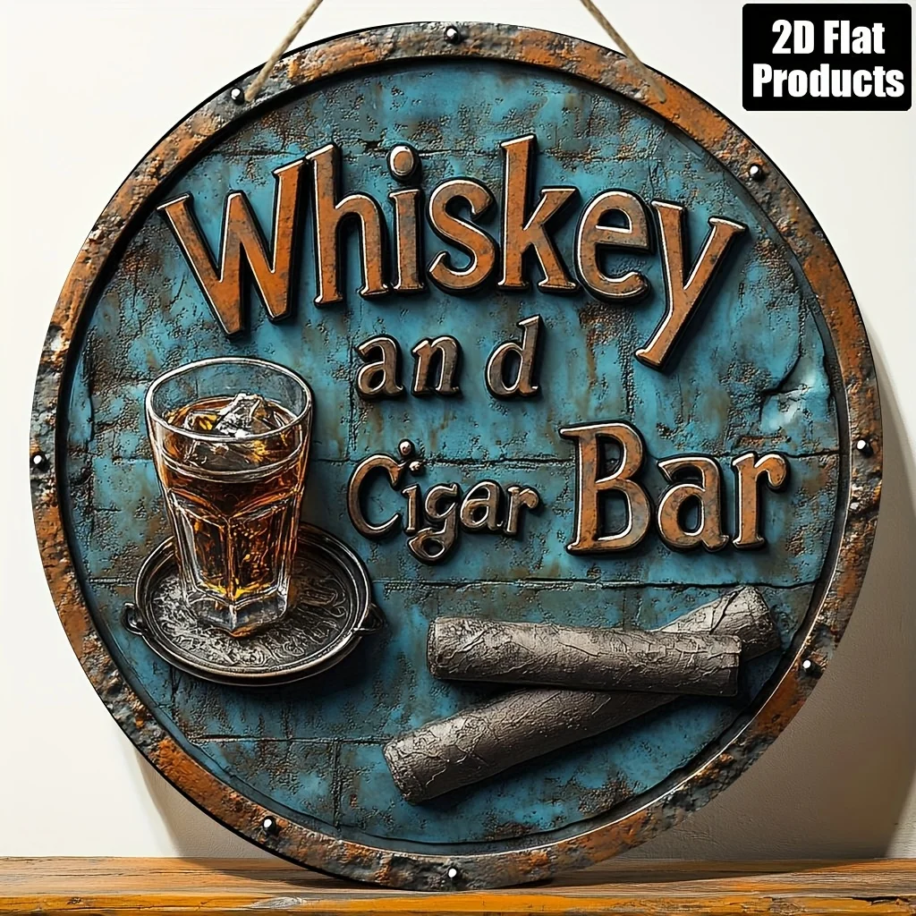 Vintage Whiskey & Cigar Bar Sign Wooden Wall Decor with Rustic Blue Patina Finish, Perfect for Home