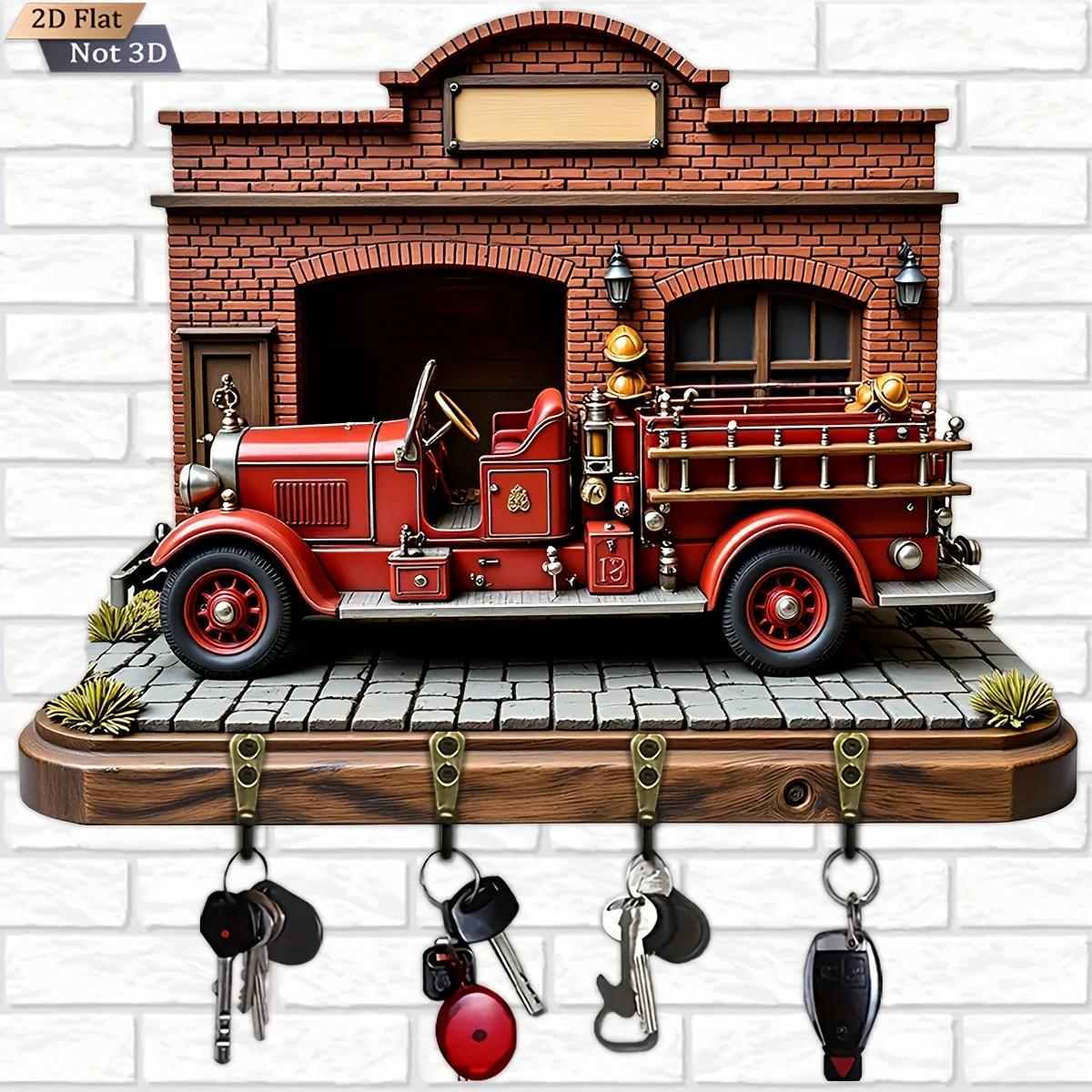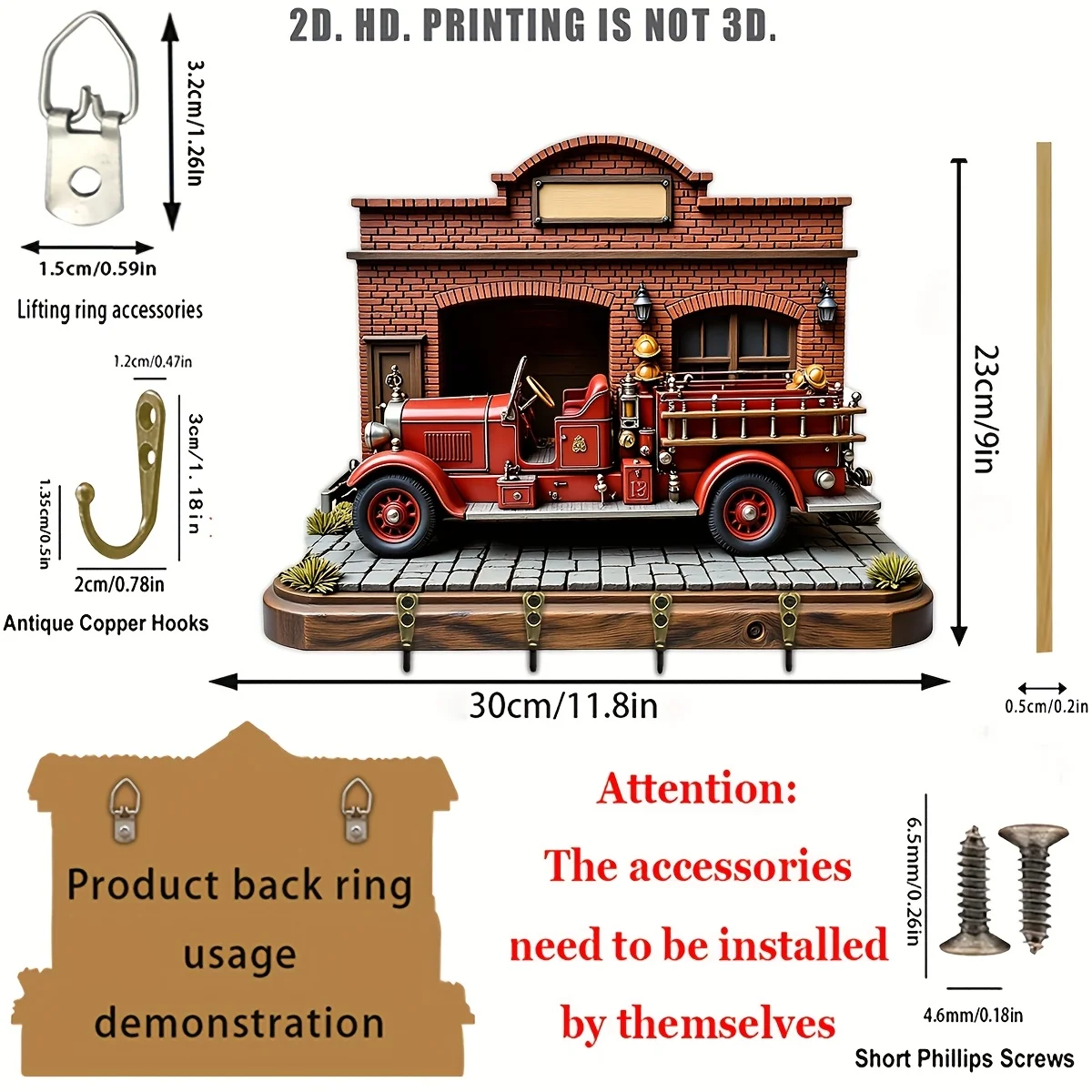 Retro Fire Truck Shaped Key Hook Wooden Multifunctional Home Key Holder with Four Metal Hooks, Wall Decoration,