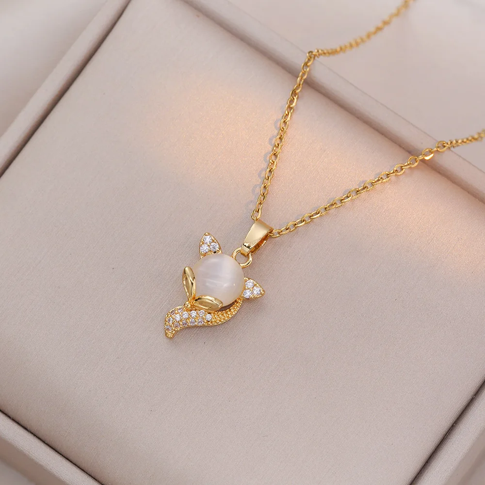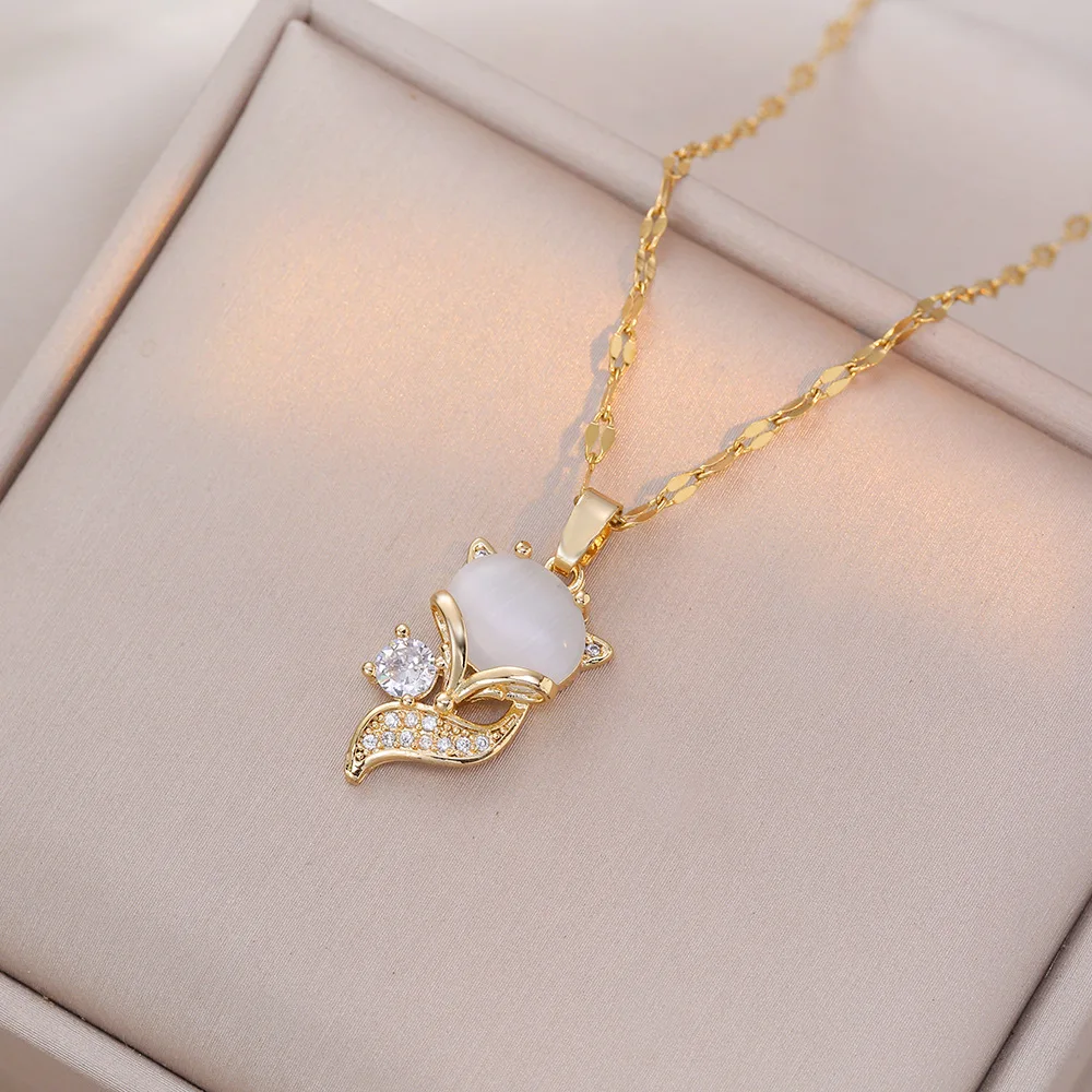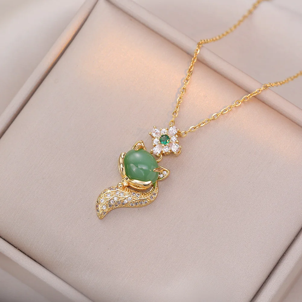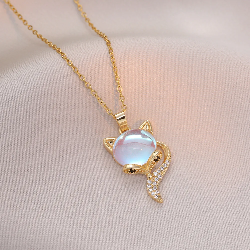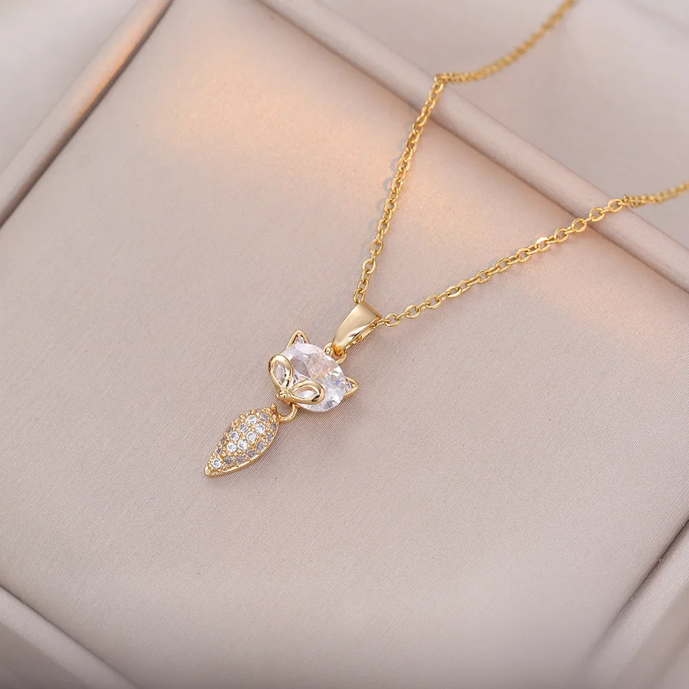 Fashion Cute Colorful Stone Fox with Zircon Necklace for Women Vintage Stainless Steel Chain Party Accessories Jewelry Gifts