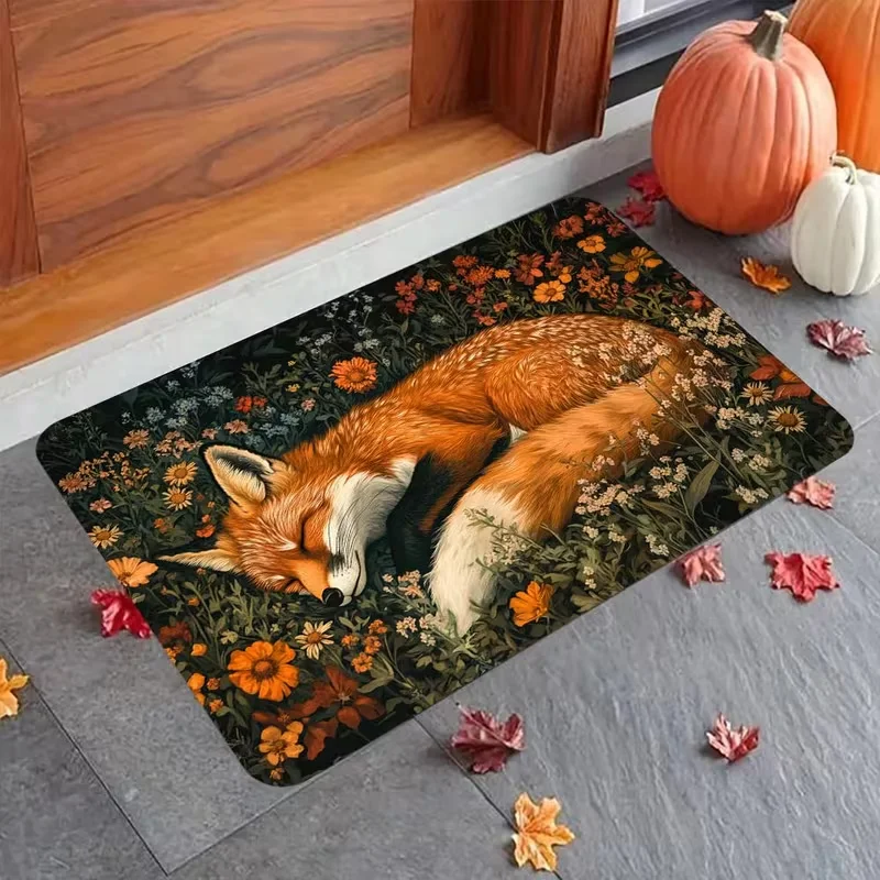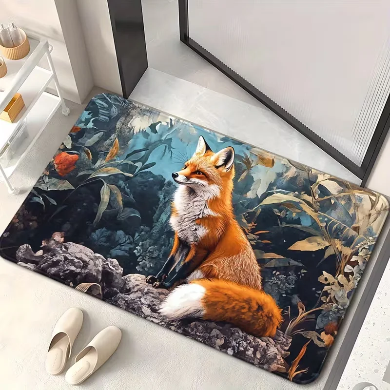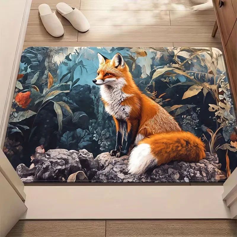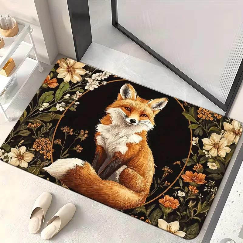 Elegant Fox Door Mat Non-Slip, Polyester Rug with Vibrant Red and White Fox Design,for Entrance, Bathroom Floor Decor Mat