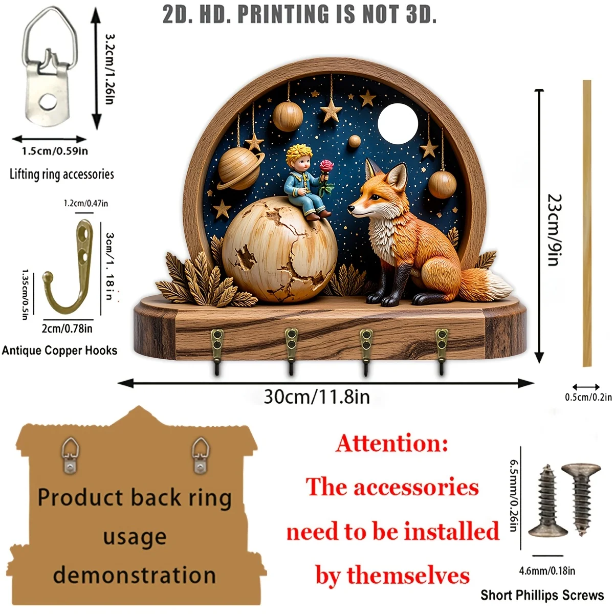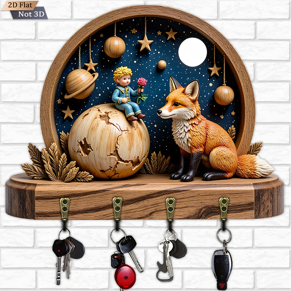 The Little Prince And Fox Planet Key Hook Wooden Multifunctional Home Key Rack, with Four Metal Hooks