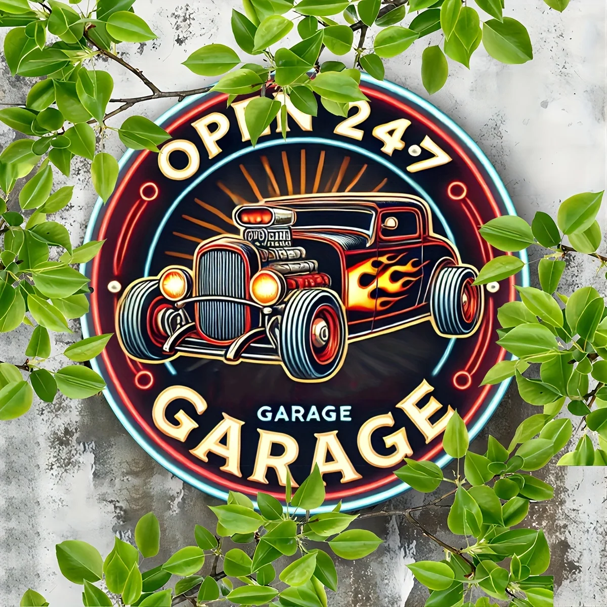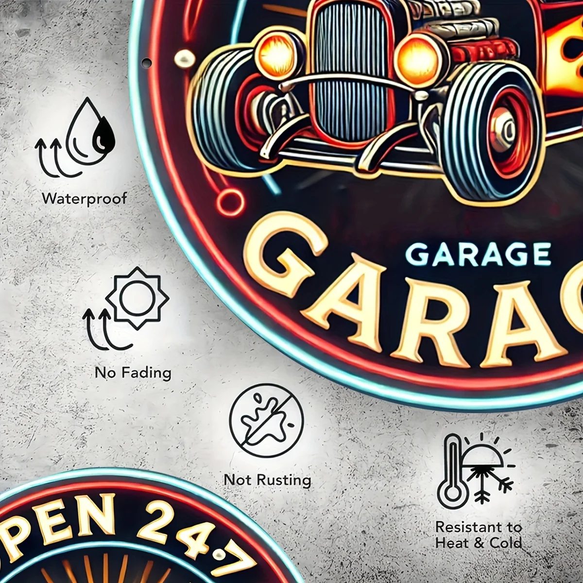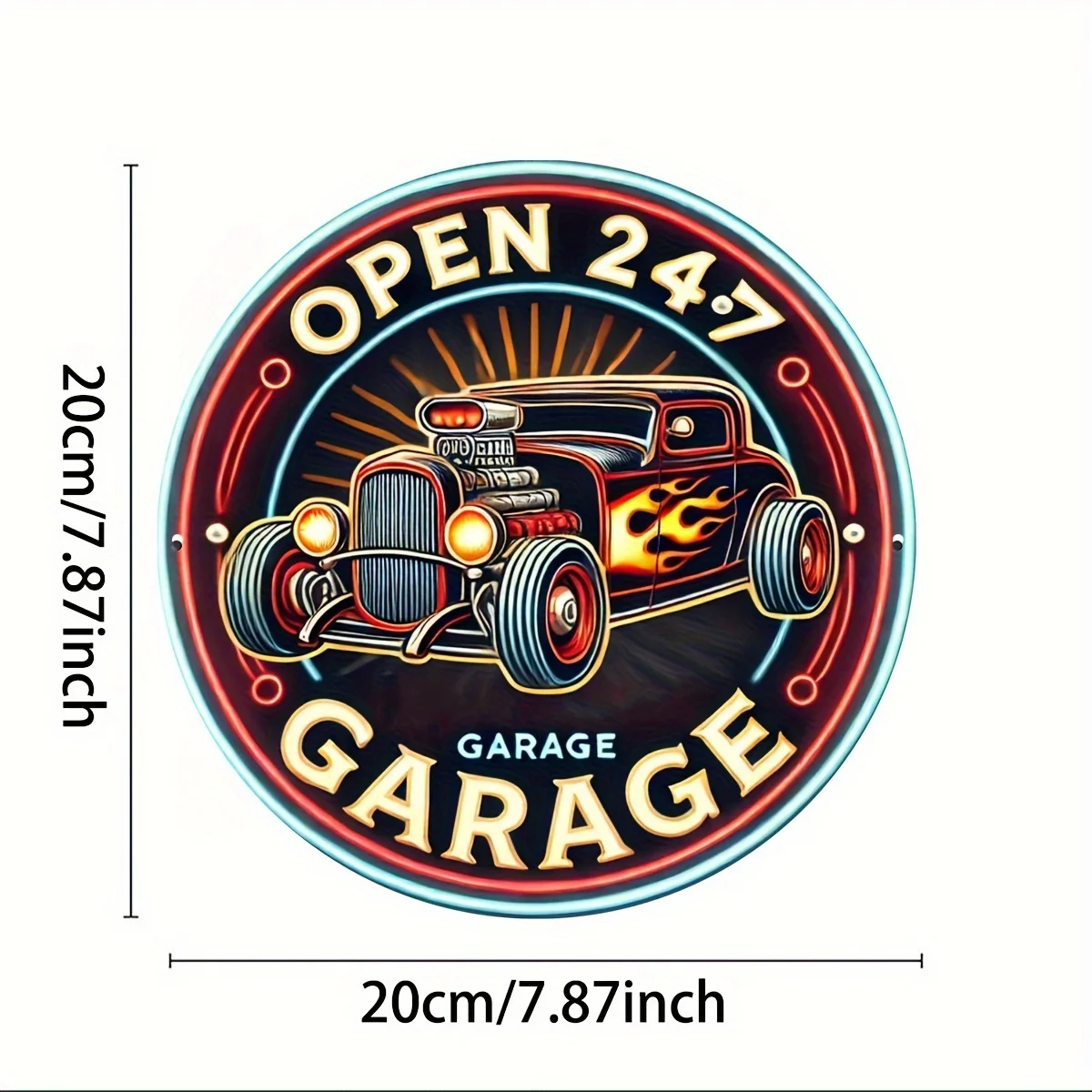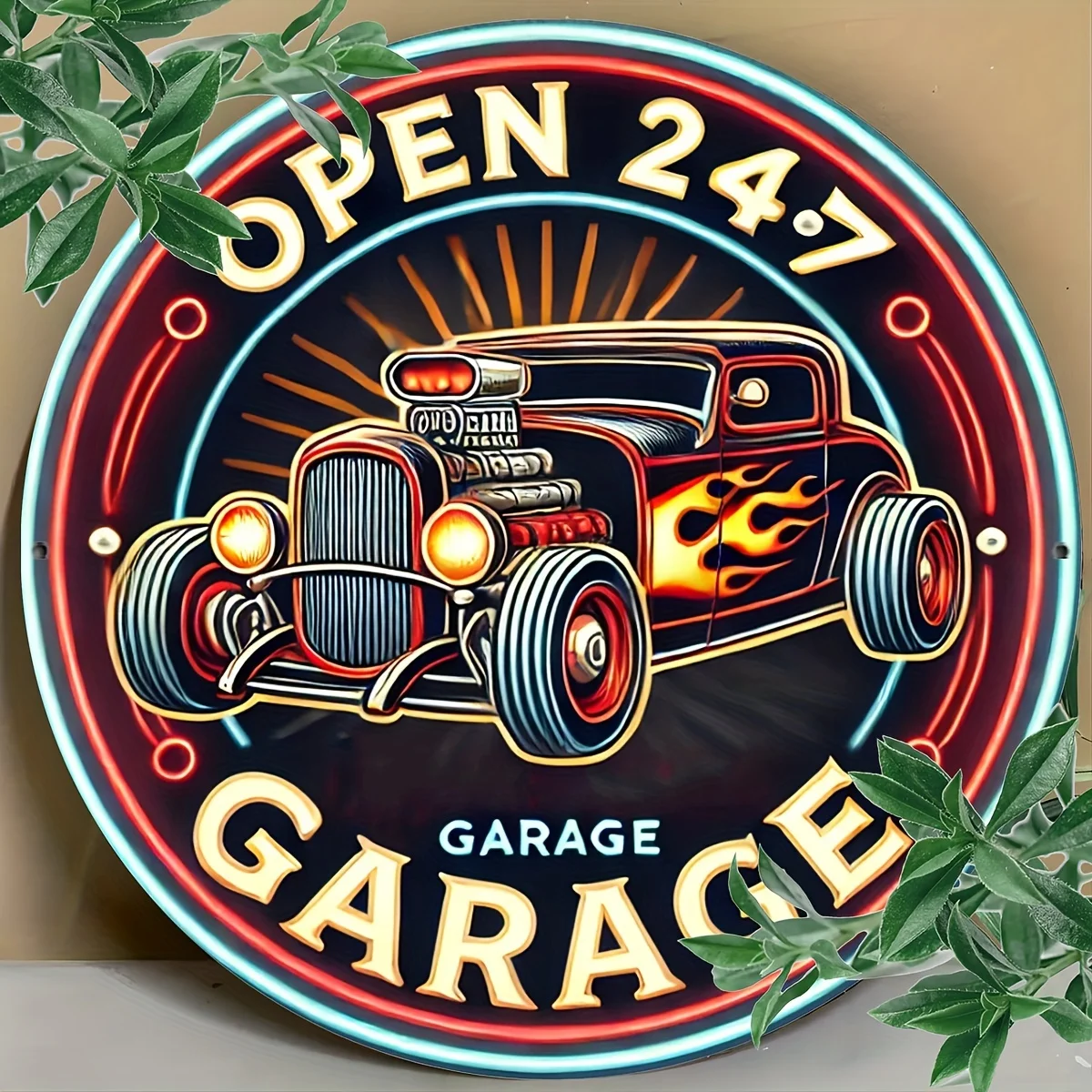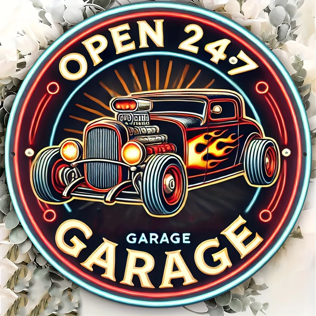 24-Hour Garage Open" Round Aluminum Wall Art Sign - 8x8 Inches, Perfect for Game Room, Dining & Bar Decor - Durable