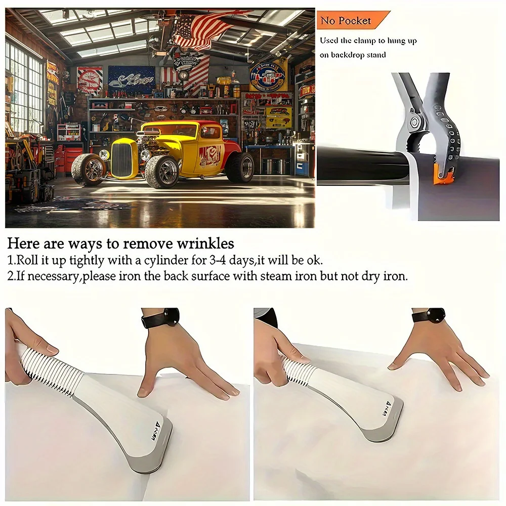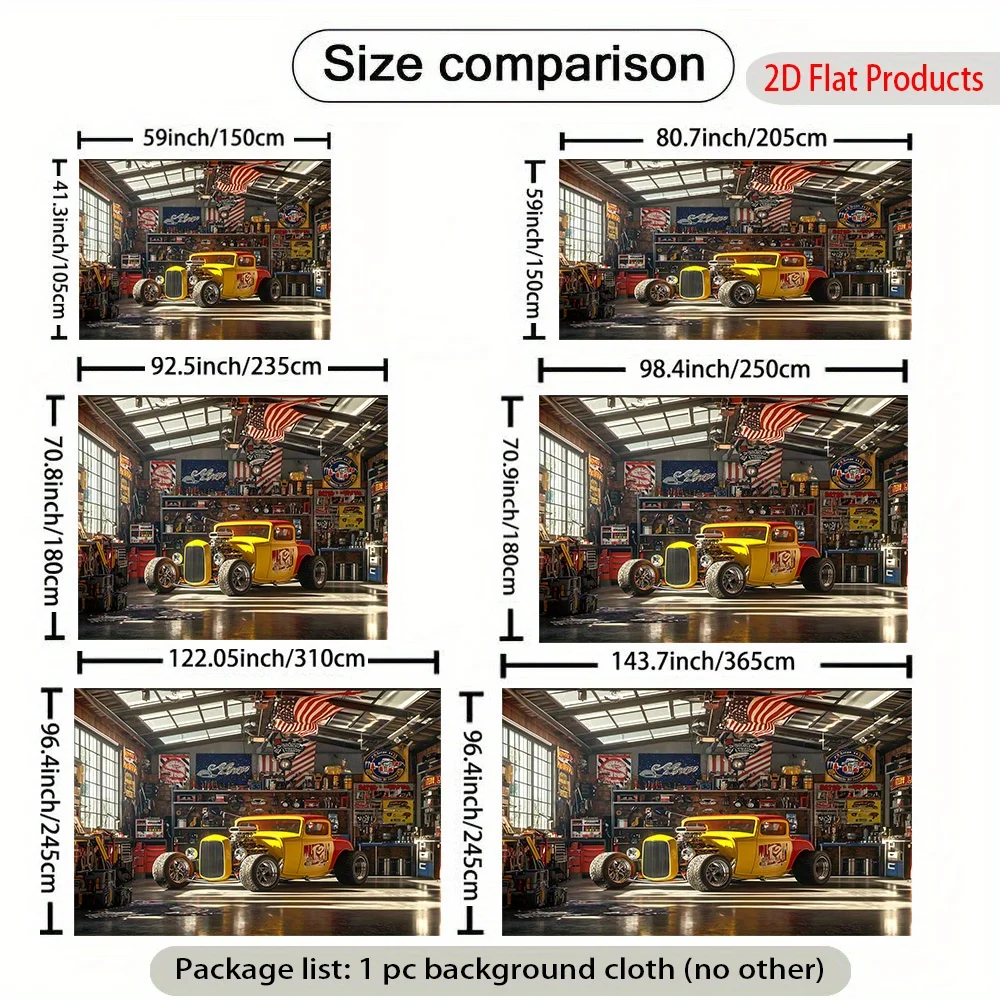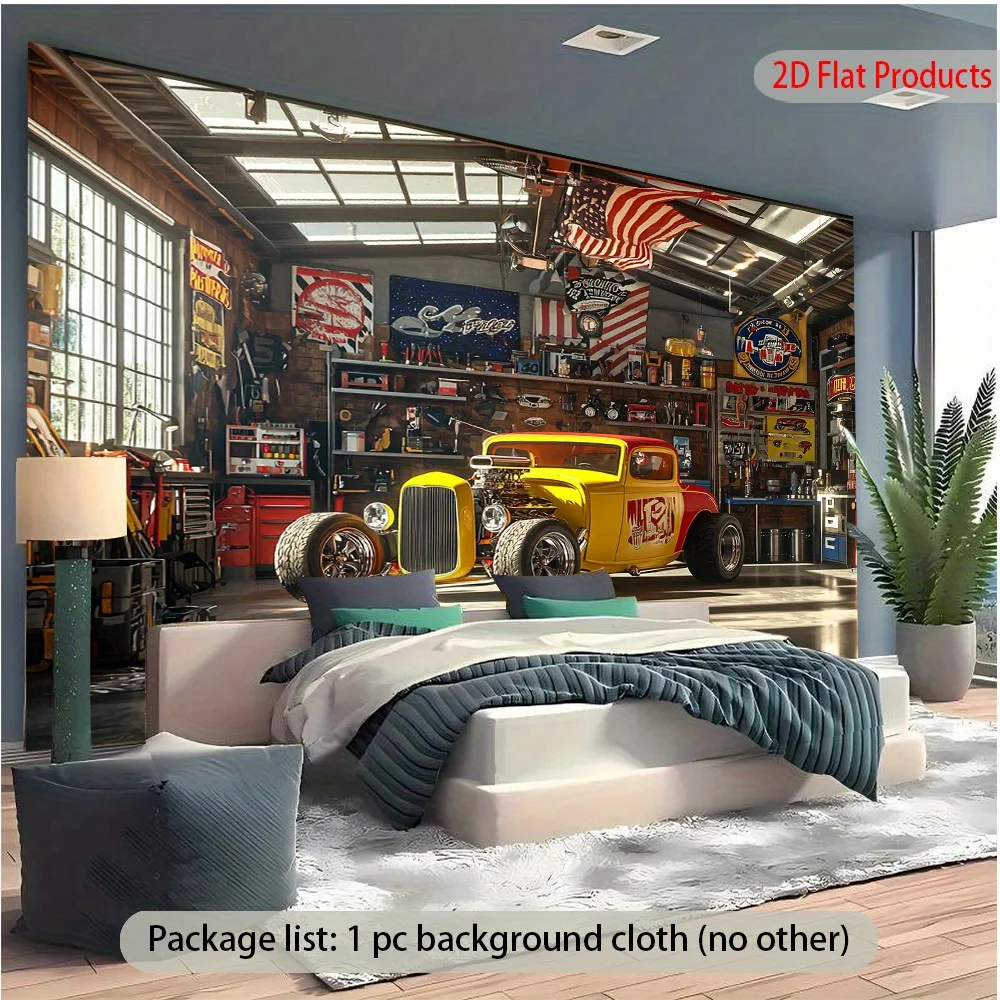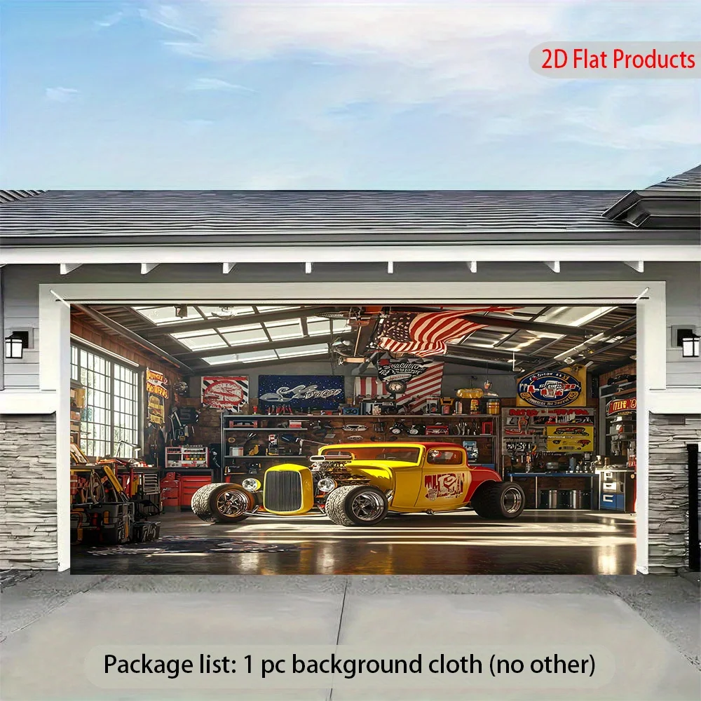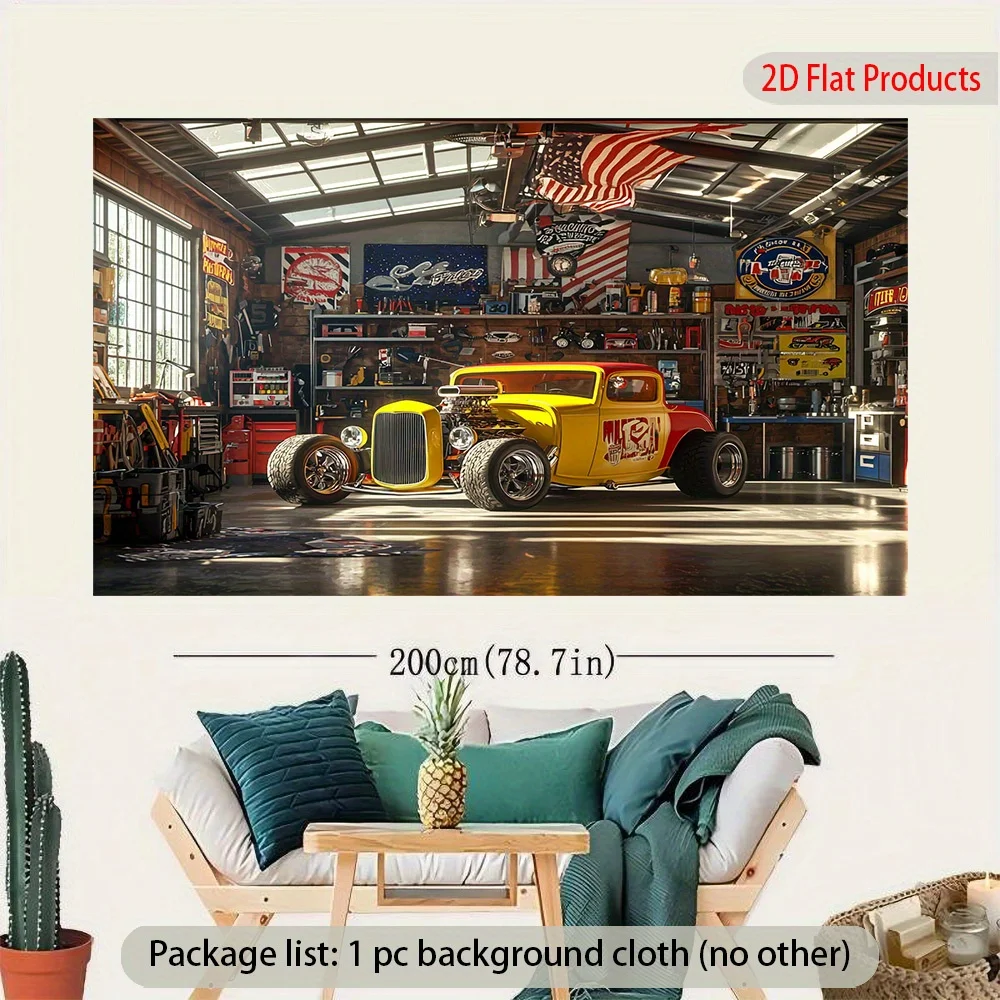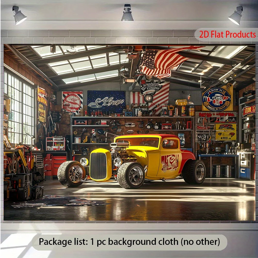 Hot Rod Car garage banner background - Vibrant yellow and red cars with the American flag, suitable for garages
