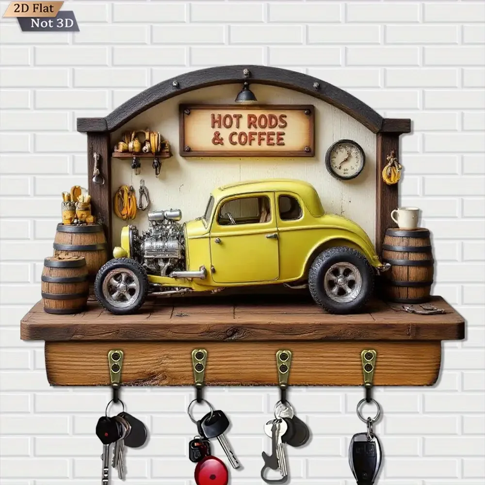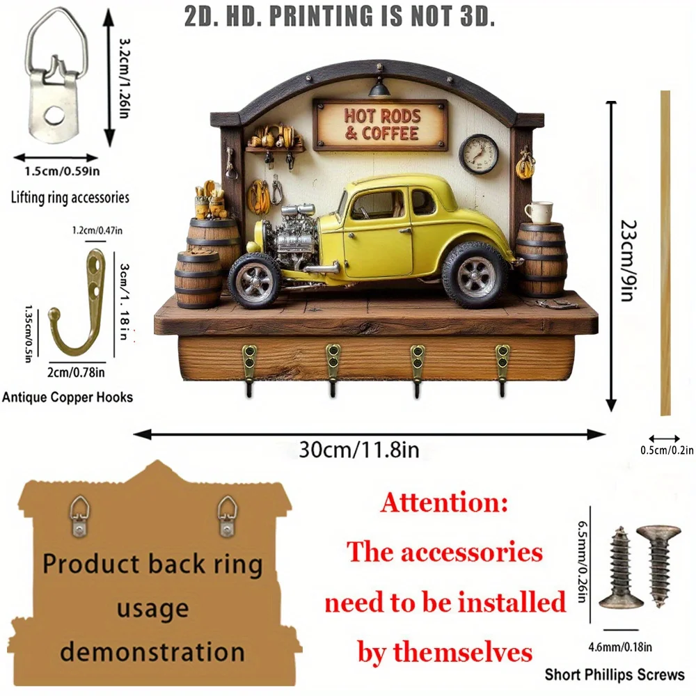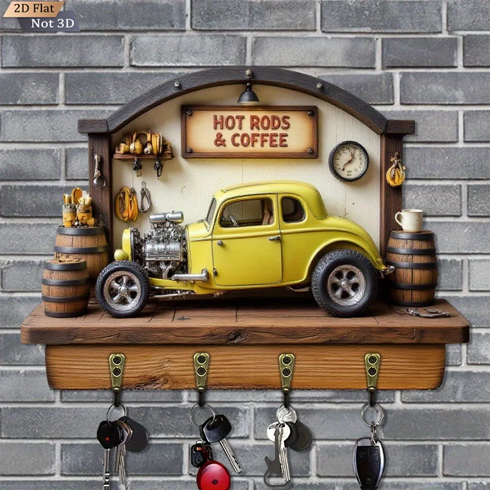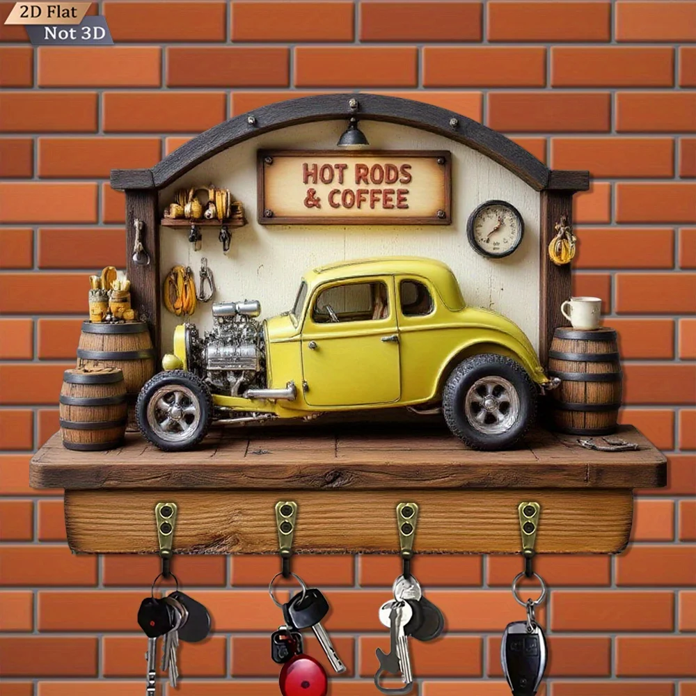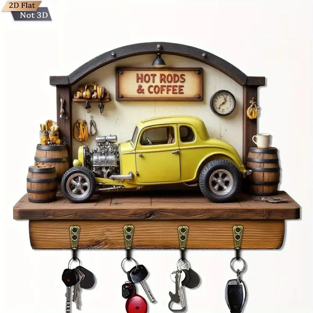 Vintage Car Style Wooden Key Holder. Multifunctional Home Key Rack with Four Metal Hooks, Wall Decoration,