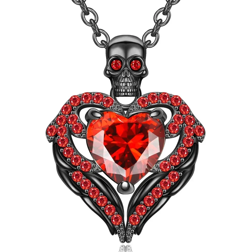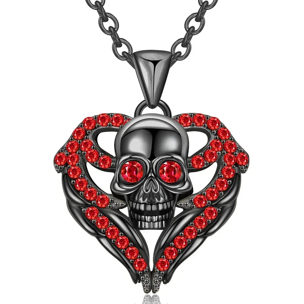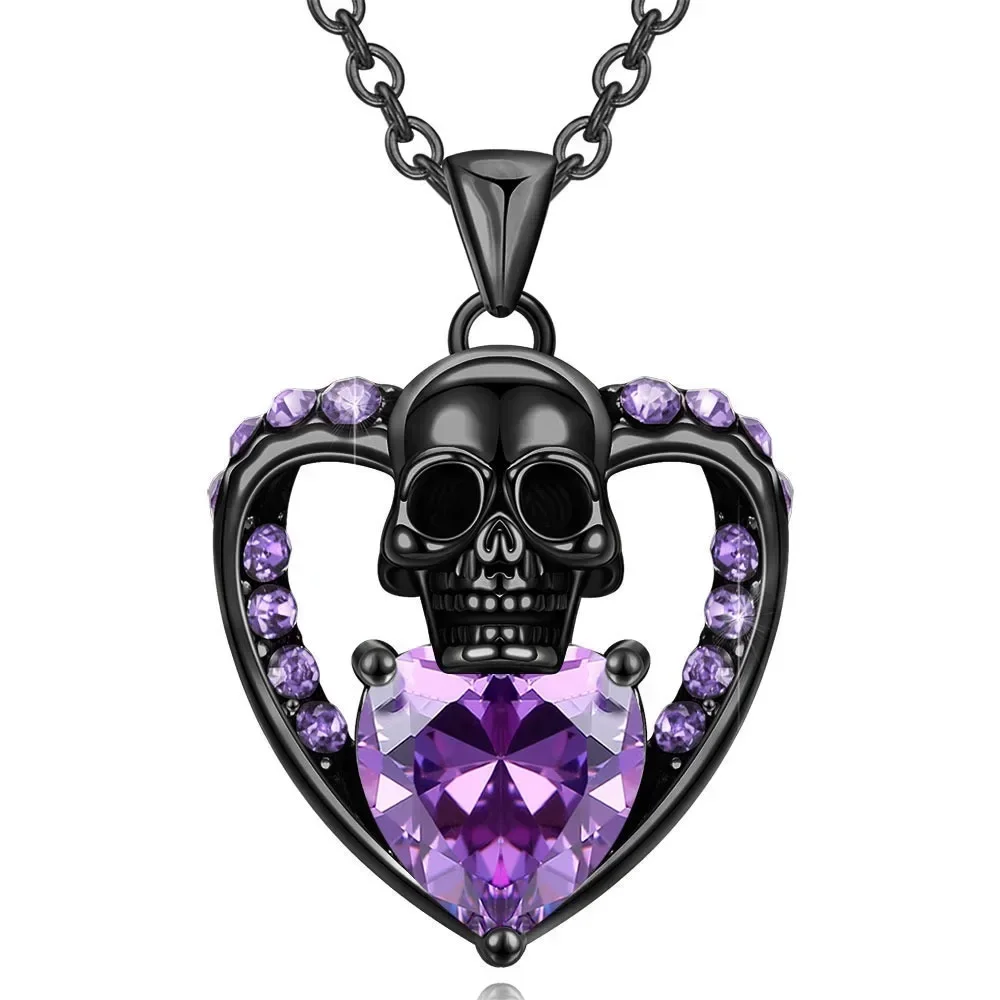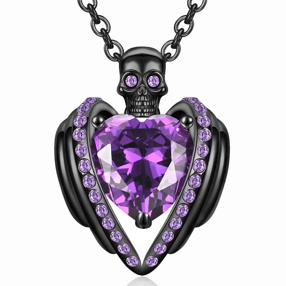 Skull Black Heart with Purple & Red Crystal Angel Wing Pendant Necklace – Gothic Gift Jewelry