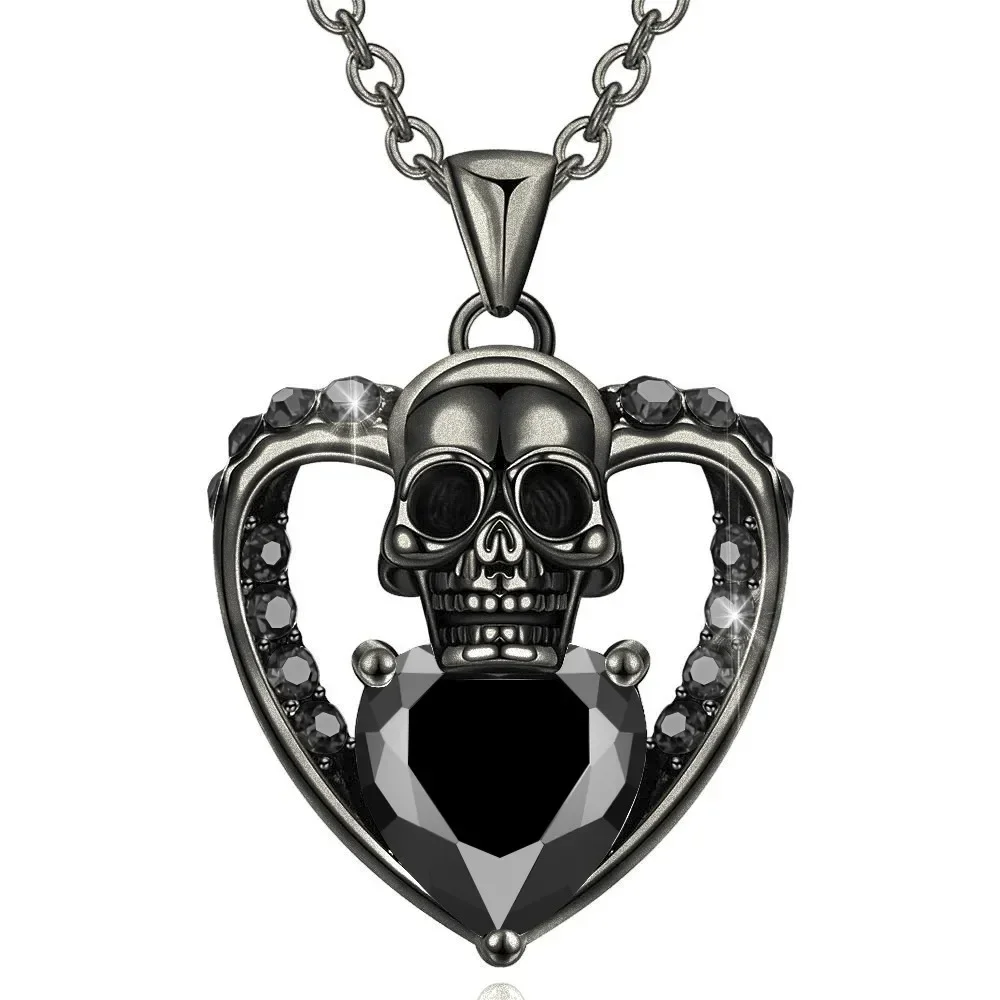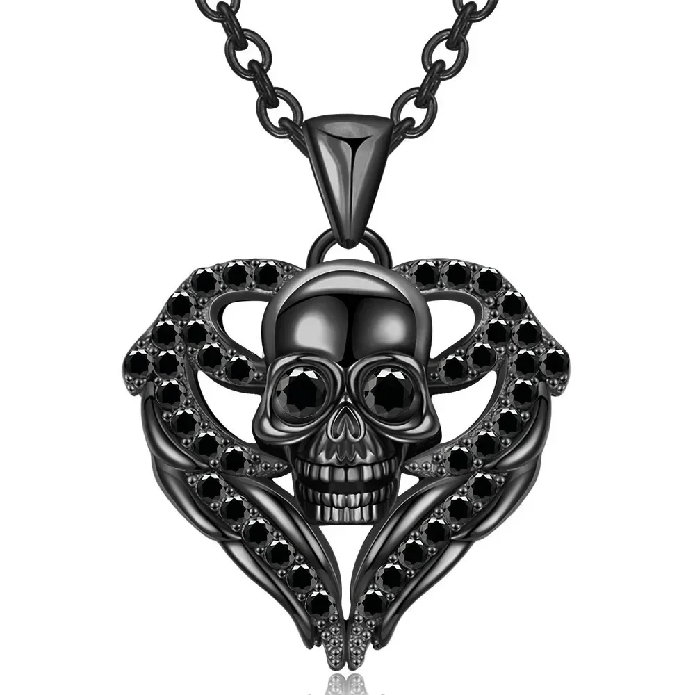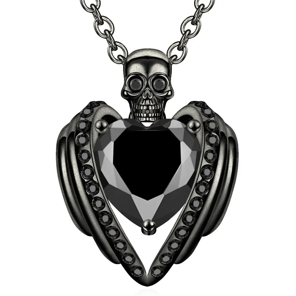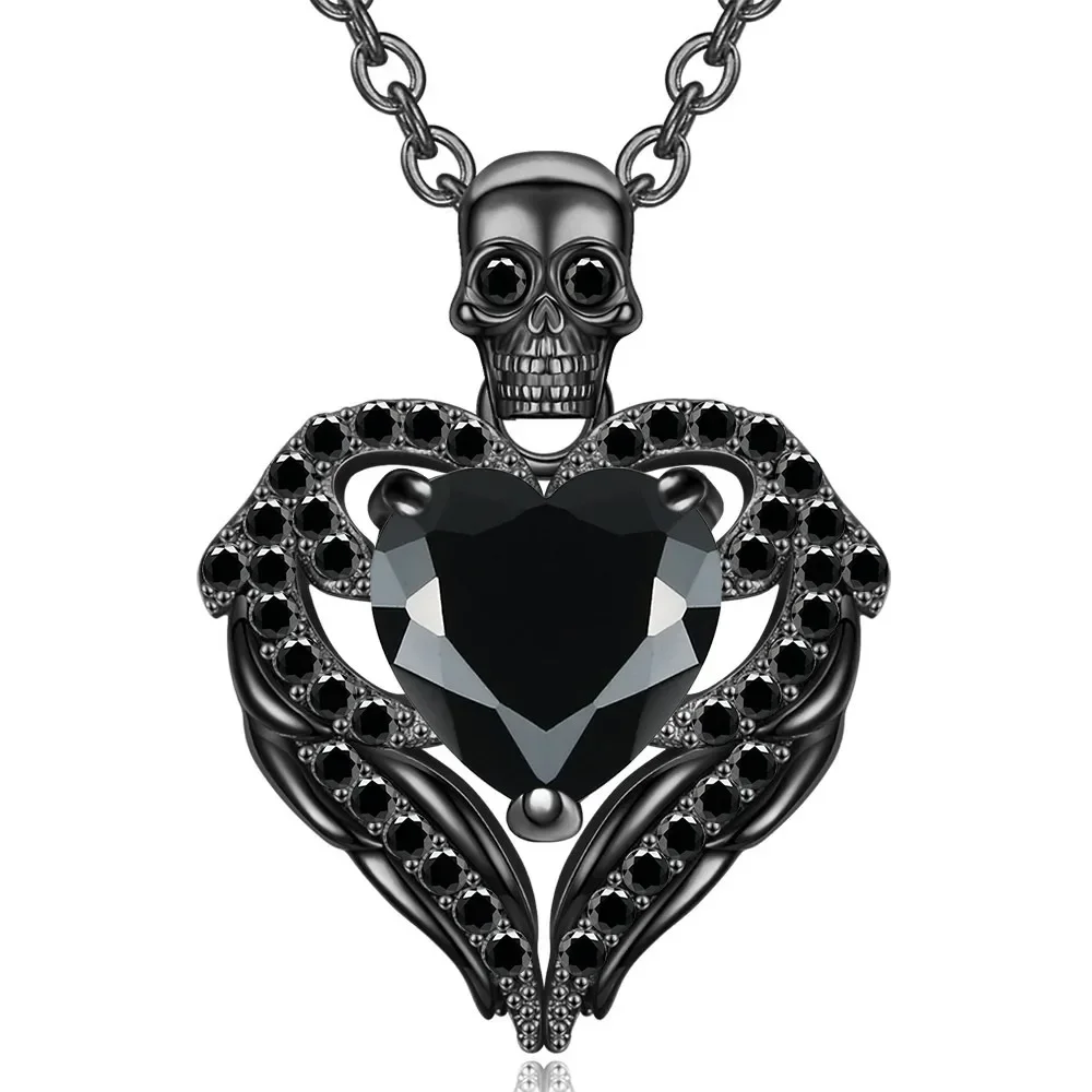 Skull Black Heart with Purple & Red Crystal Angel Wing Pendant Necklace – Gothic Gift Jewelry