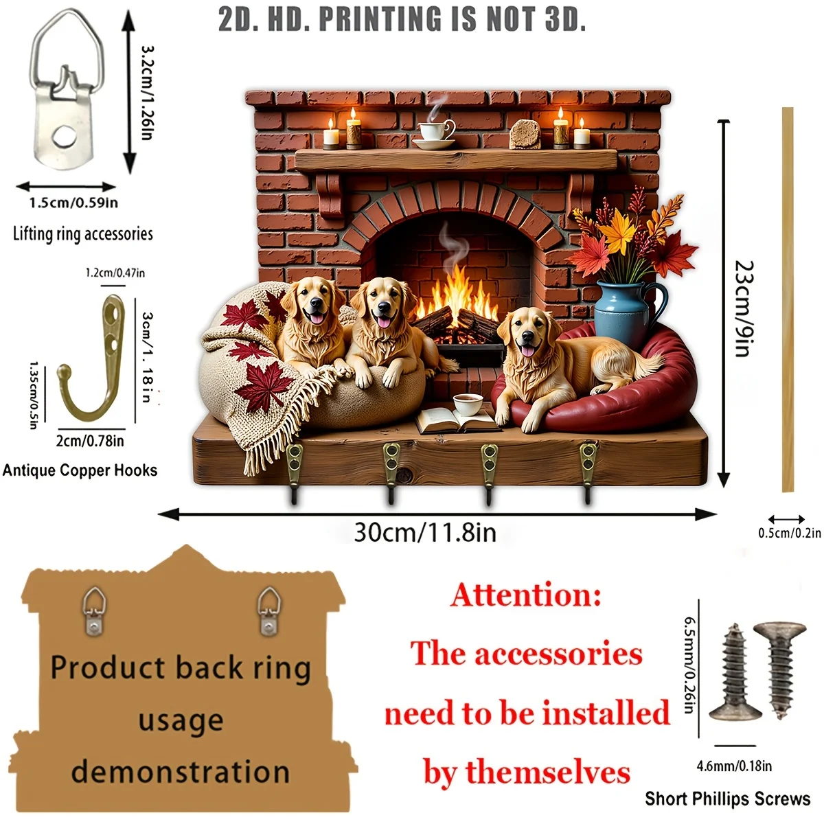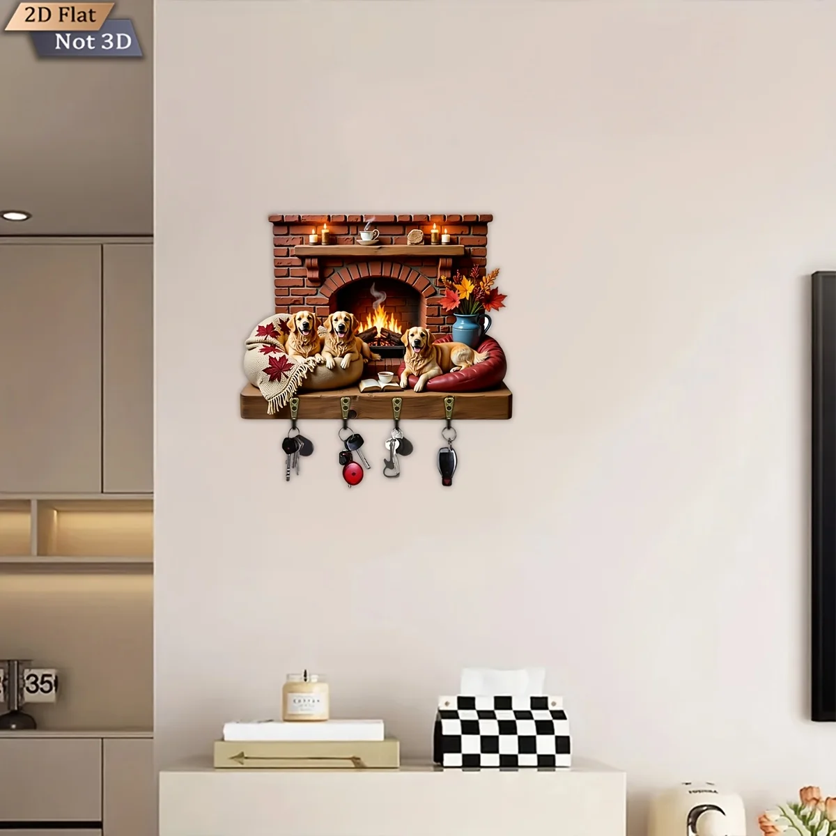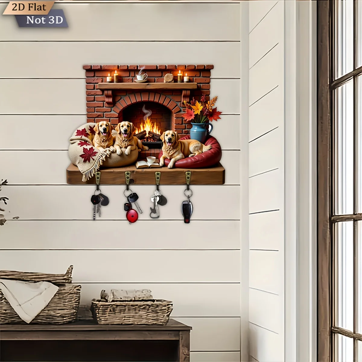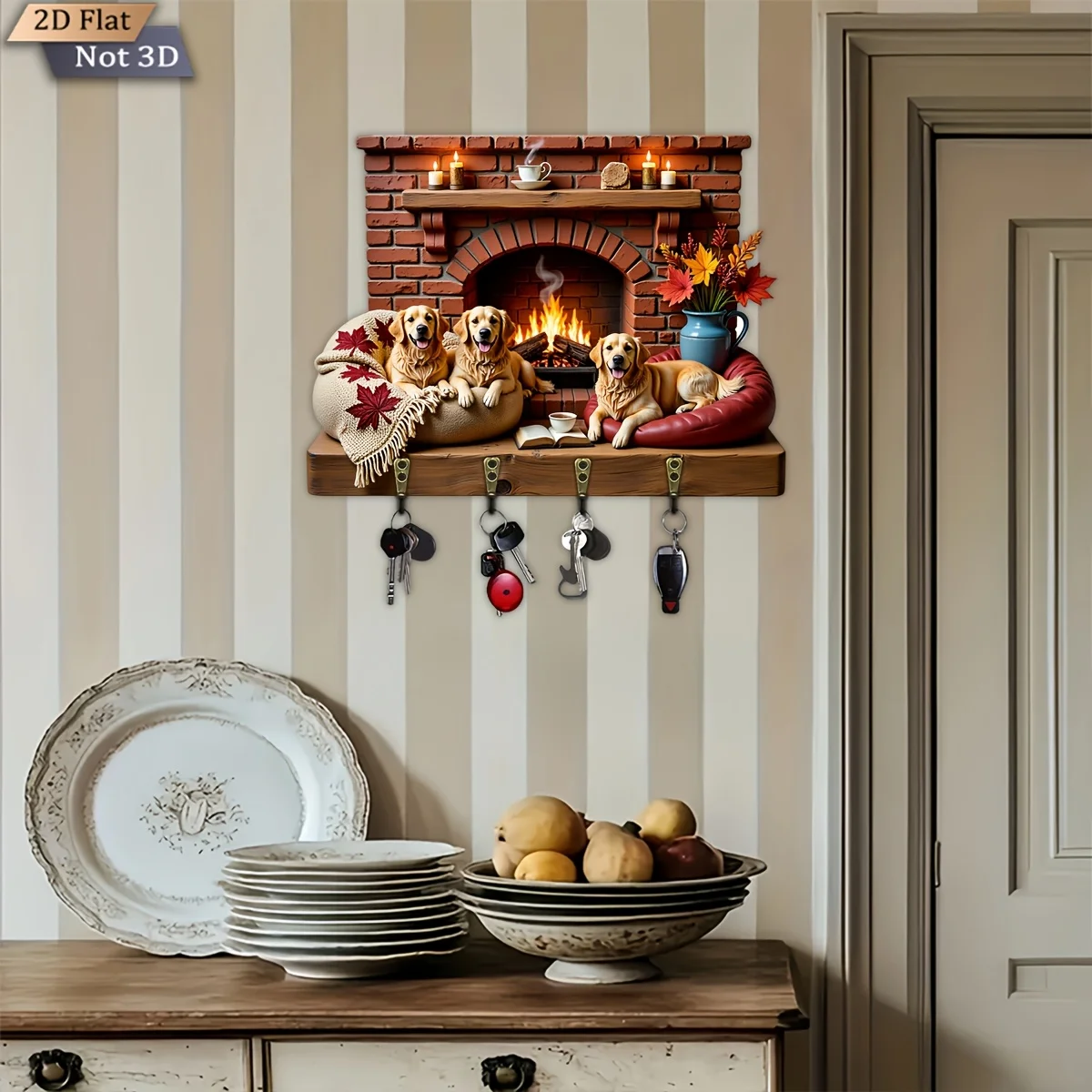 Golden Retriever Warm Theme Style Key Hook, Wooden Multifunctional Home Key Rack, with Four Metal Hooks